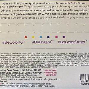 Each set includes 16 double-ended long-lasting nail strips. Easy peel and apply with no dry time. Just apply and go! 100% Real Nail Polish Strips made in the U.S.A. Get a brilliant, salon quality manicure with base coat, color/design and topcoat in minutes with COLOR STREET 100% real dry nail polish strips! Removes with nail polish remover