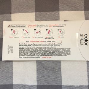 Color Street nail polish strips. Includes 16 long lasting strips of various sizes. Typically lasts about 2 weeks on nails. Made with real nail polish and can be removed with regular nail polish remover. Easy peel and apply application. Comes with nail prep pad and nail file.