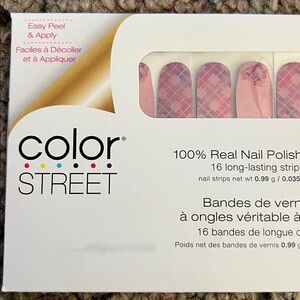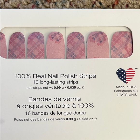 Pink plaid nail polish strips with floral accents. Long-lasting and easy to apply.