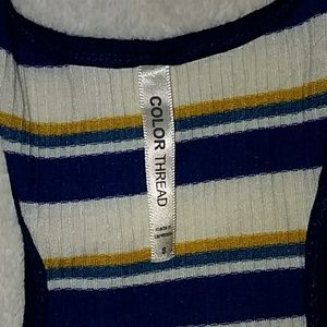A racerback striped dress that is tight fitting and breathable. I added a picture of the broken thread I found on the bottom at the back of the dress. For reference, I'm 5'5 and petite and this dress was very tight fitting and hits right at my knee