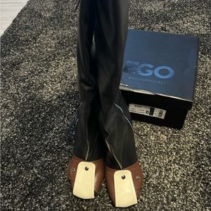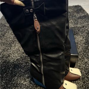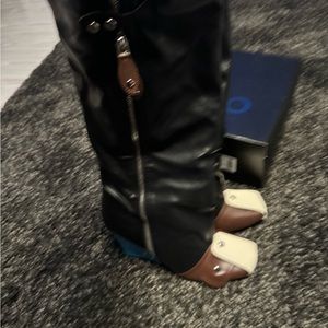 Ego color block wedge knee boots, perfect dupe for the sold out Louis vuitton patti boot. Perfect boot for a wider calf. Slips on easily with zipper detail