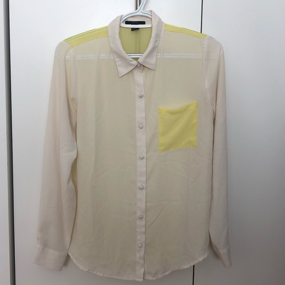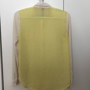 Ivory and light yellow color block shirt. Fabric drapes and creates a semi-casual fun look. Perfect for a spring look or as a base top underneath your blazer.