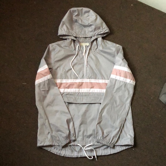 Windbreaker type jacket with drawstrings and hoodie. Pink what and grey colors