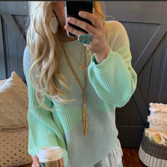 Beautiful Mint and Blueish/gray color block sweater, great for winter or light enough to pair with denim jeans for a cooler summer night.