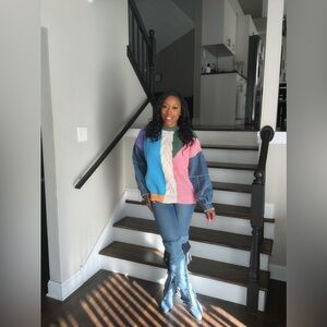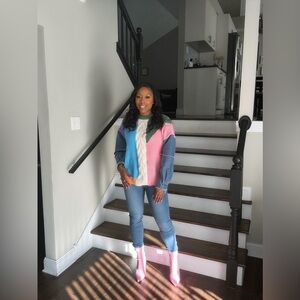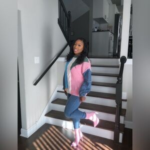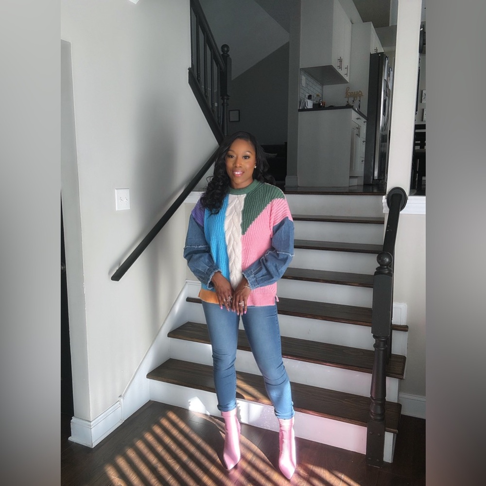 New. Color block sweater with denim sleeves. 100% polyester. One seize fits most.