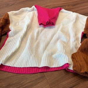 Pink, cream, and auburn colored turtle neck with flowy sleeves