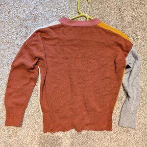 Very cozy, fall toned sweater. Small snag on backside edge.