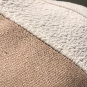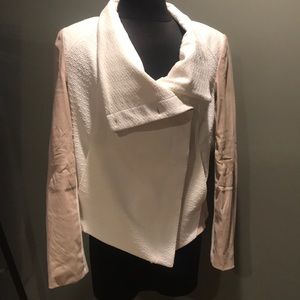 White crepe and tan faux suede Ark & Co color blocking button up jacket with pockets. Great color blocking back detail with oversized collar, dress up a pair of jeans.