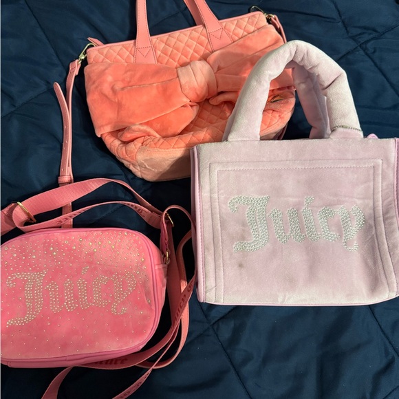 Trio of Juicy Couture bags in pink. Includes quilted and plush styles with logo accents.