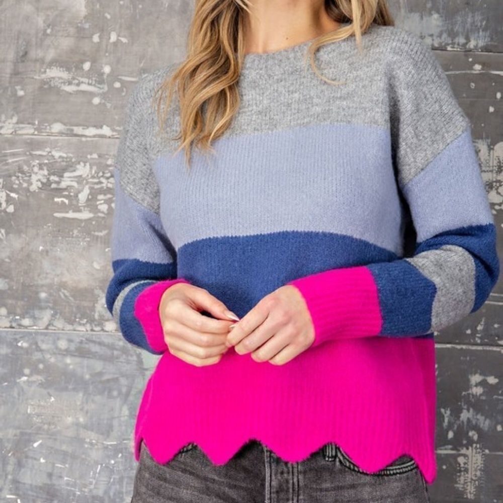 A colorblock striped sweater made in a soft knit fabric detailed with a scallop trim. Lightweight and cozy, not overly "thick". The perfect Texas Sweater! Brand is true to size.