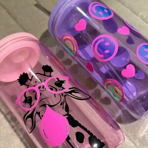 Set of two tumblers featuring a giraffe with glasses and smiley face designs.