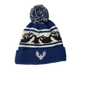 Keywords: beanie, winter hat, knit cap, pom beanie, mountain design, eagle emblem, blue beanie, white beanie, ski hat, snow hat, winter accessory, knit beanie, pom pom hat, casual beanie