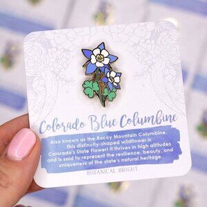 This is a high-quality and well-detailed enamel pin of a Colorado Blue Columbine Flower. There are two clasps on the back for securing the pin and preventing rotation. Each pin is about 1.25" inches tall and is packaged on its own meaning card. The pin and meaning card are further packaged in a clear plastic sleeve. The base metal is zinc alloy and is plated with gold. This is a Grade A Pin, the highest grade awarded to pins, meaning that it doesn't have any noticeable flaws.