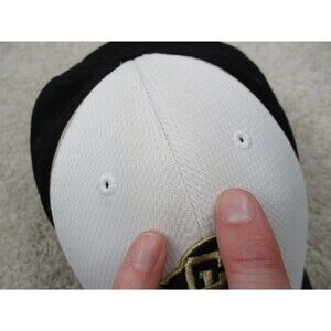 has a marker spot below the logo on front, has discoloration spots on top white exterior, some inner sweat band discoloration, the stretch inner band is shot and the elastic has mostly flaked off.