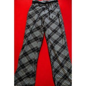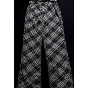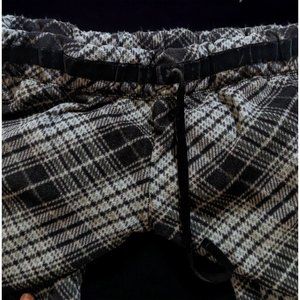 Warm and comfy plaid lounge pants by Colorado Clothing. It's made of a plush fleece-like fabric that's thick and warm. It has a black and grey plaid print, and an elastic waist. It has a velvet ribbon trim around the waist. There is a drawstring, but one end has snuck back inside in needs to be rescued. There is also a small hold in the seam at the very back of the waist, but it should be easy to stitch back up. See photos.