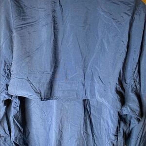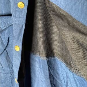 Button down shirt with roll tab sleeves, mesh liner inside, zippered pocket on the front at the bottom and two front pockets that button close, on the back has an open pocket for air movement