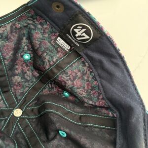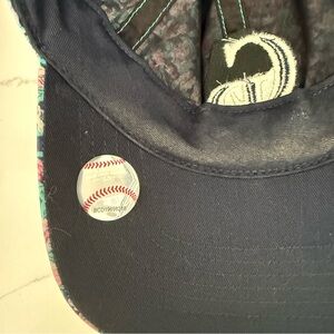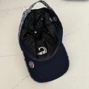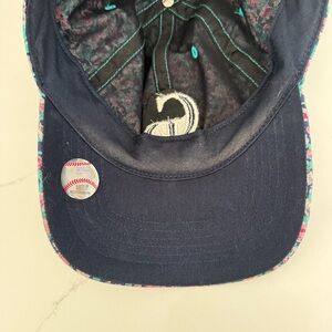 Navy cap with floral interior. Features embroidered logo. Stylish and unique design.