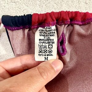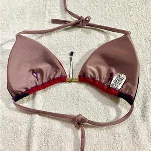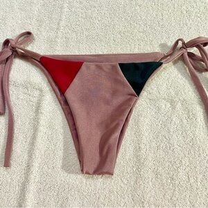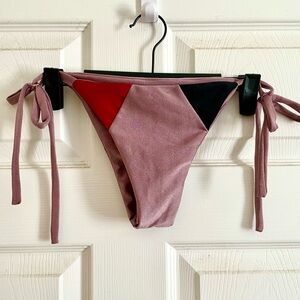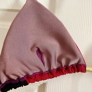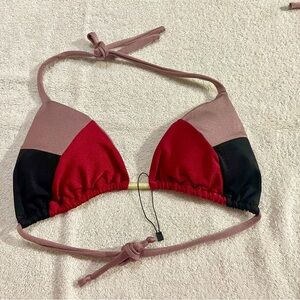 Stylish colorblock bikini set featuring a vibrant red, black, and pink design. Perfect for making a statement at the beach or pool.