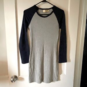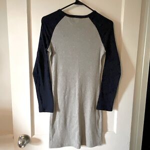 Soft, stretchy, lightweight, navy & gray dress with long sleeves.