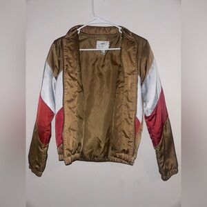 Retro-inspired and effortlessly cool, this satin bomber jacket from Forever 21 features a bold chevron colorblock design. The silky bronze, red, and white panels create a standout look that's perfect for adding a sporty, vintage vibe to any outfit.