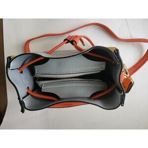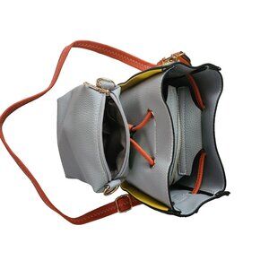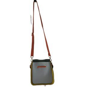 NEW stylish bucket bag features a bold colorblock design with grey, yellow, and orange tones. Its adjustable strap ensures comfort and versatility, while the drawstring closure adds a secure and functional touch. Ideal for carrying essentials with ease, it's a modern accessory for everyday use. Compact yet spacious interior Gold-tone hardware accents 8in x 8in x 4.25in