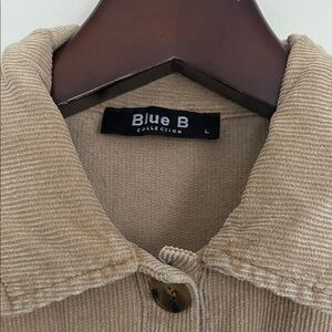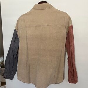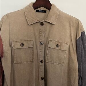 Stylish Blue B corduroy colorblock button down shirt ~ features a blend of tan, burnt orange and gray colors for a trendy look. Perfect for casual outings.