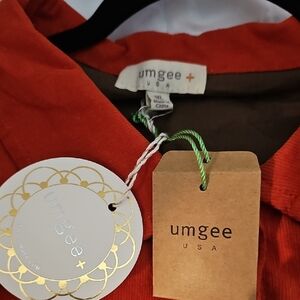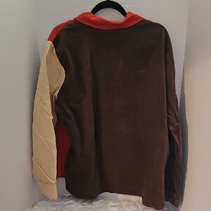 Stylish colorblock jacket with button-up front. Features red, brown, and tan panels. Perfect for a trendy look.