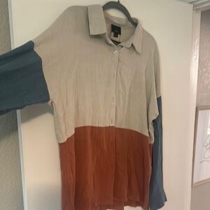 Stylish colorblock button-up shirt with long sleeves. Features beige, blue, and rust colors.