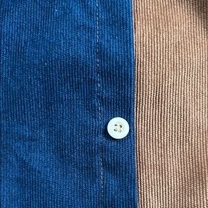 Stylish colorblock button-up shirt with brown, blue, and green panels. Features a front pocket and classic collar.