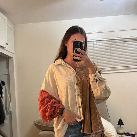 Stylish colorblock button-up shirt with cream, brown, and orange sections. Perfect for casual outings.