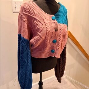Stay stylish with this vibrant colorblock cable knit sweater. Featuring a mix of pink, blue, and brown, this sweater is perfect for adding a pop of color to your wardrobe.