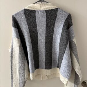Striped colorblock cardigan sweater. Featuring a blend of cream, gray, navy and tan hues, this sweater is perfect for layering.