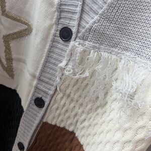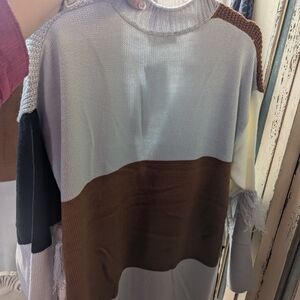 Stay cozy and stylish with this colorblock cardigan sweater. Featuring a mix of brown, black, gray, and cream, this piece is perfect for layering.