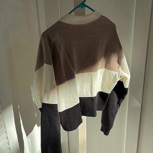 Stylish colorblock sweater. Features a collared neckline. Perfect for casual wear.