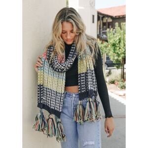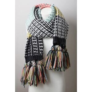 Stay cozy and stylish with this bold multicolor knit scarf featuring oversized tassels and a unique open-weave texture. The textured open-stitch design gives it an airy yet cozy feel, while the multicolor tassels add playful movement and bohemian flair. The mix of black, white, mint, coral, and gold tones makes it a standout accessory for any outfit. Soft, breathable, and full of personality — perfect for layering through fall and winter.