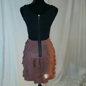 Colorblock Dress in black and marroon/mauve color. Bottom half is ruffled, zipper is in the back, falls at my knees (I'm 5'5" tall). Size small. Excellent condition, no stains, tears or any imperfections.