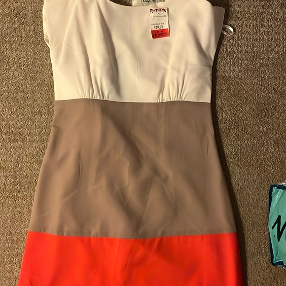 Stylish colorblock dress featuring a chic combination of white, gray, and red. Perfect for any occasion.