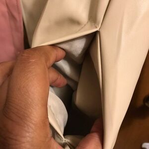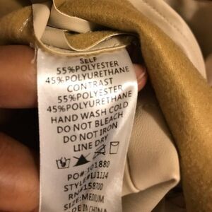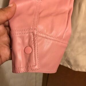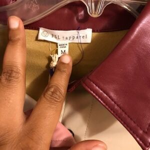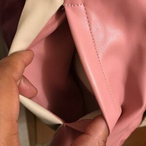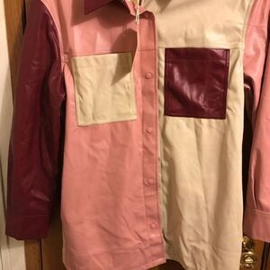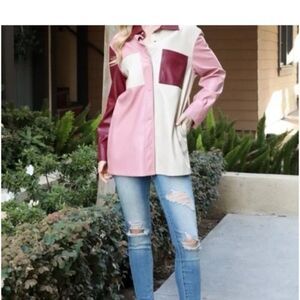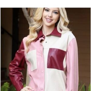 Stylish colorblock faux leather shirt jacket in pink, cream, and burgundy. Features a button-up front and chest pocket. Cream,pink and Burgundy color block.This Top has a pocket on each side
