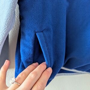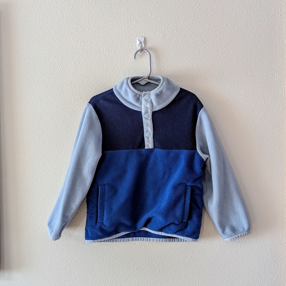 Different colors of blue with snaps at the collar and pockets in the front. No flaws, but some very minor pilling. Super cute and warm, and the quality you expect from this brand! Fits a 4T/5T