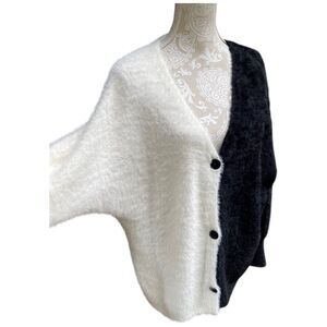 Wrap yourself in comfort with this super soft, fuzzy cardigan, a cozy-chic piece perfect for lounging, layering, or cool-weather strolls. The color-block design in ivory and charcoal adds modern contrast, while the oversized fit and drop shoulders create that effortlessly relaxed, boutique look.