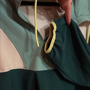 Stylish colorblock pullover with a half-zip design. Features mint green, cream, and dark green sections. Perfect for casual wear.