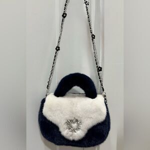 One of a kind. Stunning & high quality, handmade real fur purse. Made from genuine premium dyed Mink fur. Mink fur handle, fold over flap and shiny imitation crystal buckle design. Spacious enough for your phone, wallet, sunglasses, cosmetics, keys and other items. Includes 1 leather strap and 1 custom chain, use in multiple ways, hand carry, wear as a shoulder bag or crossbody.