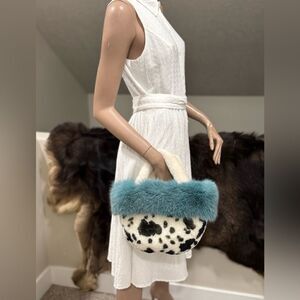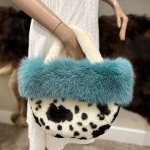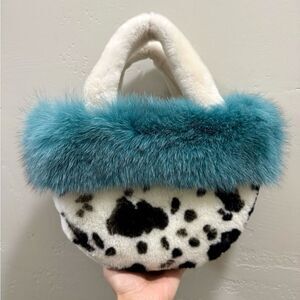 One of a kind. Very unique and multi use style. This Luxury real fur bag, handmade from genuine shearling leather with natural premium Fox fur trimming, beautiful cow print and colorblock design.