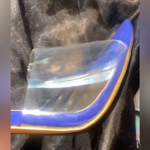 Lightly Worn, snug fit clear shoe with pink and yellow ankle straps