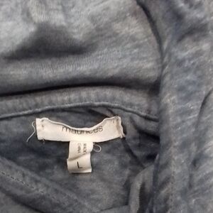 Maurice stylish colorblock hoodie with a drawstring. Features blue, white, and red sections. This hoodie features a thin material that is perfect for springtime use. It has fashionable drawstring with large metal circles to hold the drawstring. This is a very unusual hoodie but unique, too.