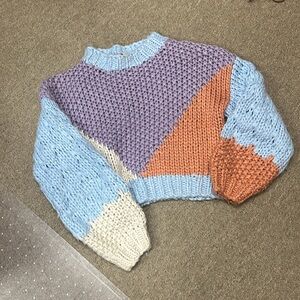 Stylish colorblock knit sweater. Features purple, blue, orange, and cream sections. Cozy and trendy design.