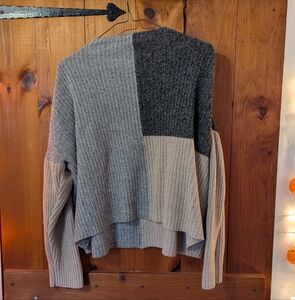 Stylish colorblock knit sweater in gray and cream. Perfect for cozy days.