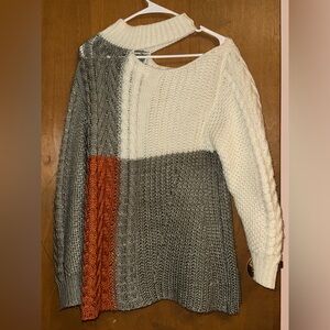 Stay cozy and stylish with this colorblock knit sweater. Featuring a blend of cream, gray, and orange, this sweater is perfect for any casual outing.