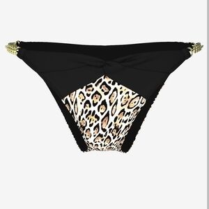 Stylish leopard print and black bikini set with gold chain accents. Perfect for a chic beach look.