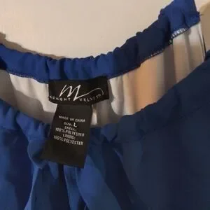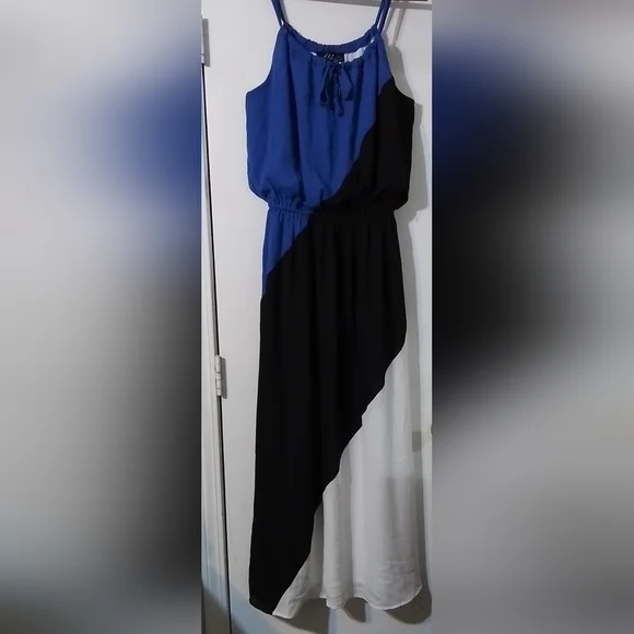 Multi colored maxi dress, 100 % poly and has a lining. no pockets.